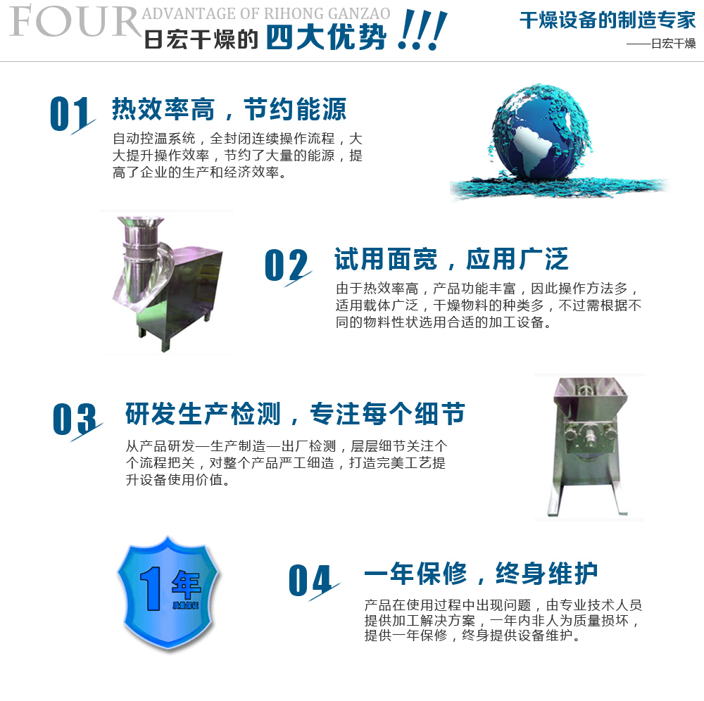常州市日宏干燥有限公司可根據(jù)用戶(hù)的實(shí)際要求進(jìn)行工程設(shè)計(jì),目前單條生產(chǎn)線(xiàn)的產(chǎn)量有500kg/h、1000 kg/h .1500 kg/h。3000 kg/h等。雞精生產(chǎn)主要包括粉碎、秤重、混合、制粒、干燥、分篩、加香等步驟,我公司生產(chǎn)的具有工藝設(shè)計(jì)緊湊、設(shè)備制作精美、流水化運(yùn)作程度高、產(chǎn)品品質(zhì)穩(wěn)定、易清潔保養(yǎng)等特點(diǎn)。設(shè)備與物料接觸部位全部采用優(yōu)質(zhì)不銹鋼材料,并經(jīng)過(guò)精細(xì)拋光,耐鹽份腐蝕,清洗更方便,符合食品生產(chǎn)管理的QS要求及GMP標(biāo)準(zhǔn)。